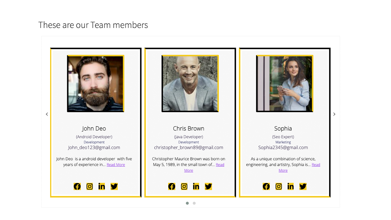 其他最有用的功能之一是团队幻灯片的响应式设计。所有团队幻灯片将根据设备大小显示。例如,如果设备是移动设备,则一次只能显示一张幻灯片,如果设备是 ipad,则一次显示两张幻灯片,如果设备是台式机,则显示 3 张幻灯片。您可以从管理设置面板设置幻灯片的数量。