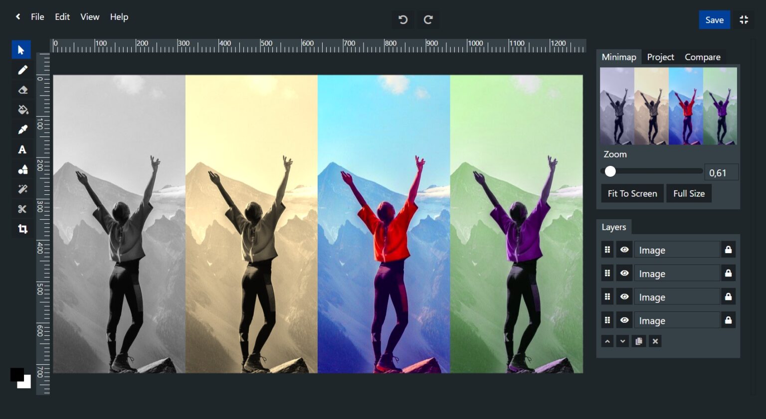 使用 20 种流行的图像过滤器增强您的图像,例如灰度、棕褐色、复古、黑白、模糊等等。 您可以将多个过滤器应用于任何图像层。