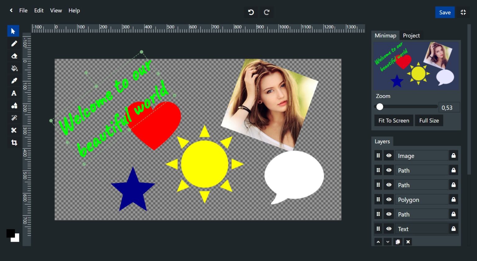 如果您还没有准备好图形,您可以将其保存为项目以便以后继续工作、重置过滤器、图层尺寸或在导出为图像文件之前更改任何内容。