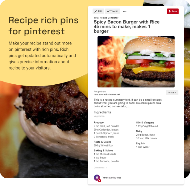使用 Total Recipe Generator,您的在线食谱内容以适当的语义和层次结构进行组织。 这可以提高您的网站在搜索结果和 Pinterest 等个性化媒体平台中的存在。 食谱帖子生成的内容是模式微数据、内部链接、JSON LD 微数据和“食谱”内容类型所需/推荐的元标记的混合。