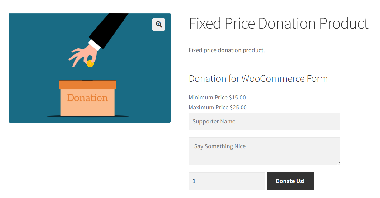 捐赠固定金额,您可以为产品设置金额并设置最小值和最大值,以便访问者可以在最小值和最大值范围内付款,但如果不支付自定义金额,也可以设置固定金额。