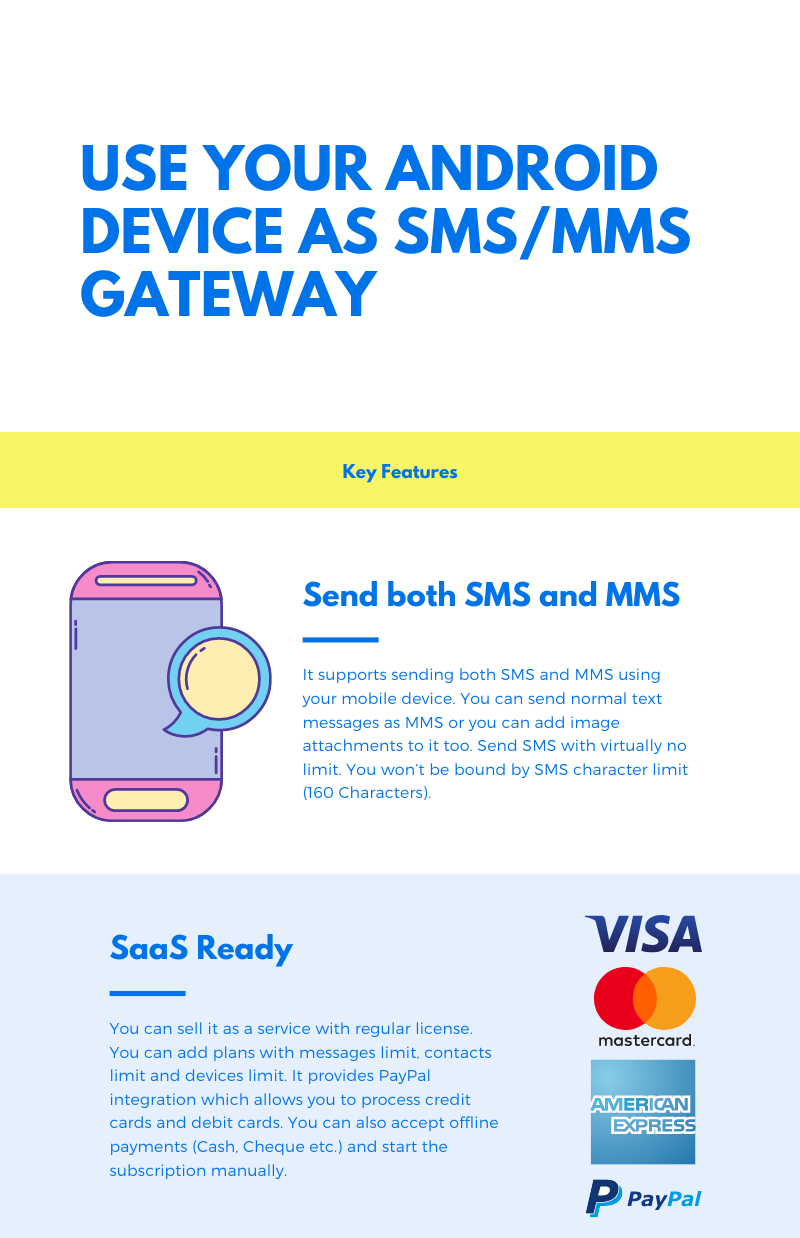 支持非常长的消息:- 几乎没有限制地发送短信。您将不受短信字符数限制(160 个字符)的约束。