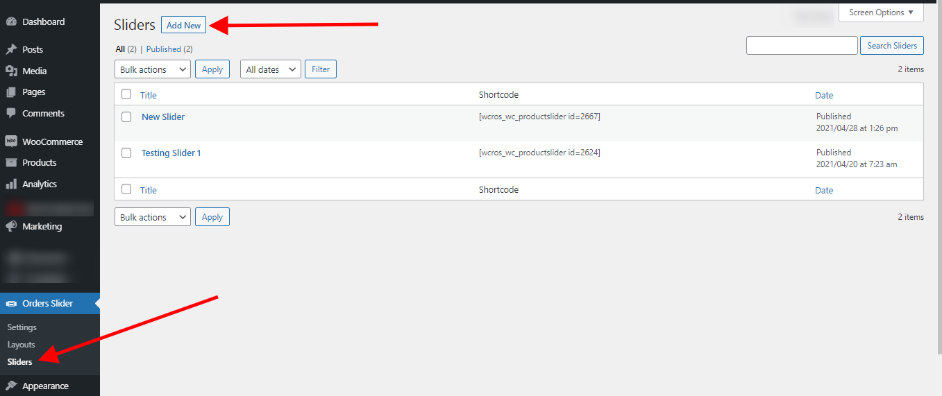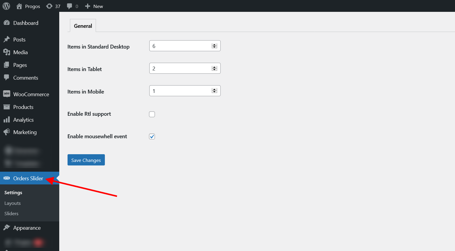 安装插件后,管理仪表板中将出现一个标题为“订单滑块”的新菜单。 该菜单有三个子菜单。