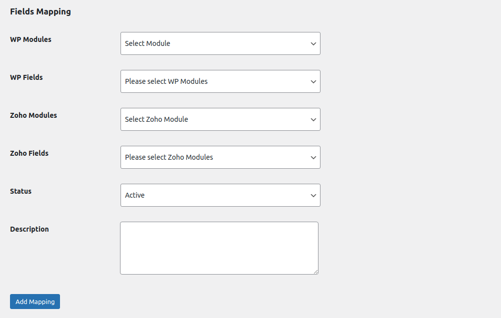 在 WP 模块和 Zoho 模块之间添加 N 个映射(模块可根据您的 Zoho 账户)