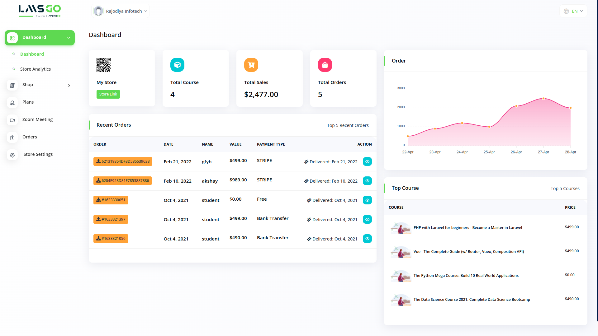 由于商店在两个方面运营,LMSGo SaaS 将提供 2 个仪表板来有效管理两者;后端和前端。在此处获取总课程、销售额和订单的概览,以及您的热门订单和最近订单的列表。此外,在此处找到您过去 15 天的订单图。