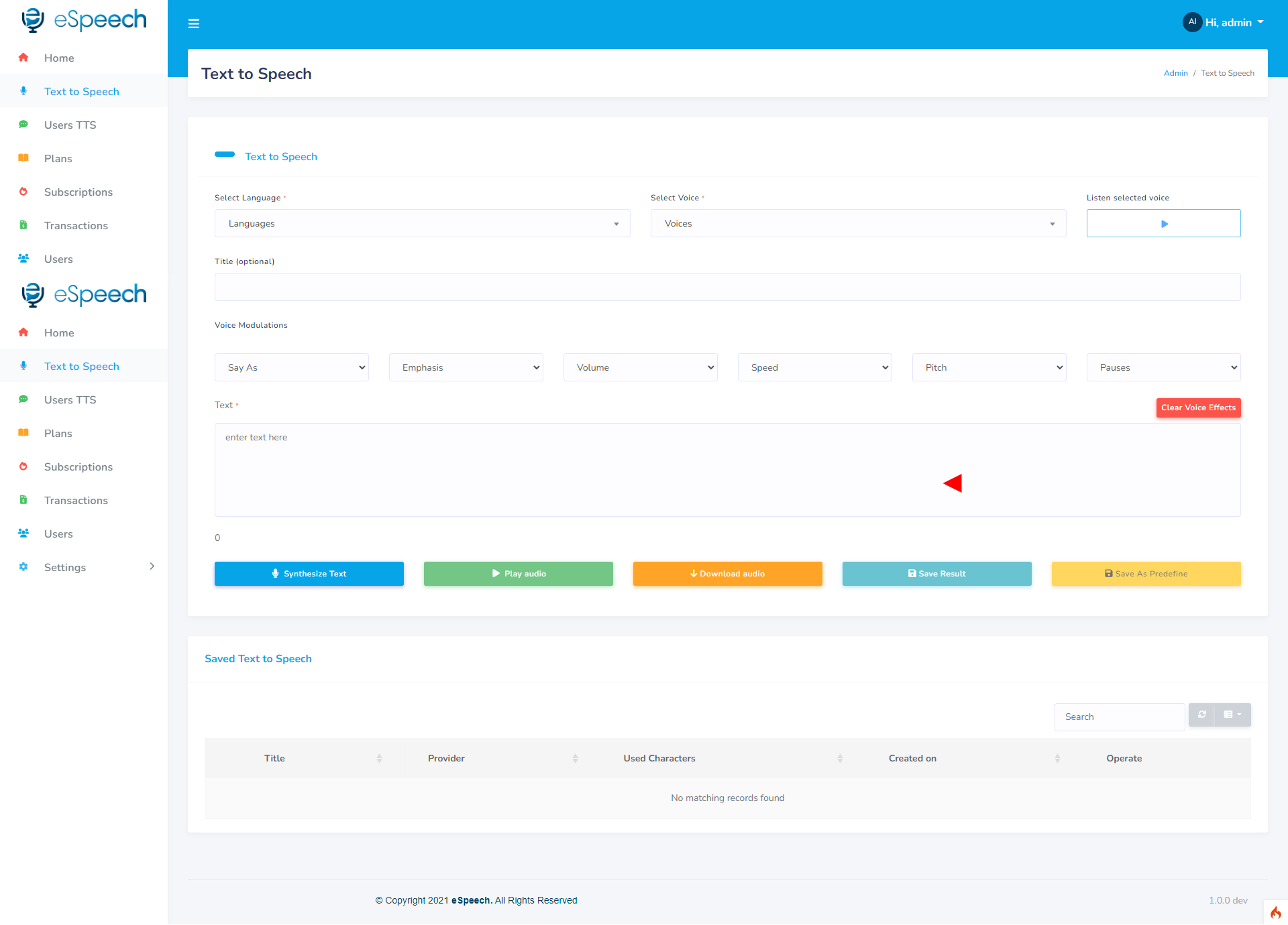 eSpeech 解决了管理来自 Microsoft Cognitive Services、Google Cloud Platform、Amazon Polly 和 IBM Watson 等多个提供商的文本到语音合成的问题。 它提供了一个平台,您可以在其中合成来自所有给定提供商的任何语言的文本,而无需担心繁琐的集成过程。 您只需专注于您的业务模型,它将处理系统的所有其他技术方面。