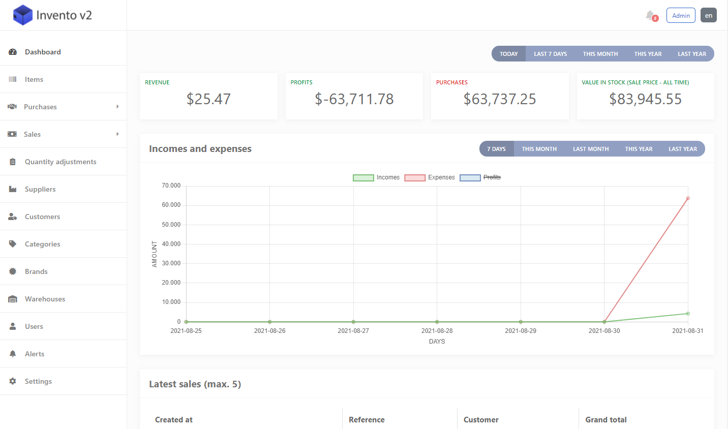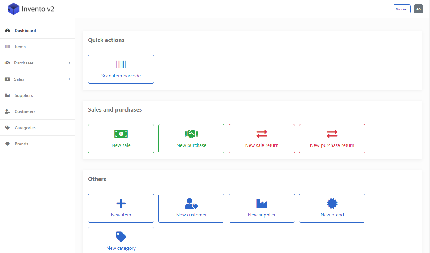 Invento v2 是使用 CodeIgniter 4 (PHP) 以及 jQuery、Axios、Datatables 等其他技术创建的库存系统。使用 Invento v2,您将能够管理您拥有的一个或任意数量或仓库中的库存。如果你也有工人和主管,没问题! Invento v2 包括用户角色。最后但并非最不重要的一点——您可以将它与 Android 应用程序一起使用!这个应用程序现在将为您提供基本功能(通过扫描条形码查找项目的能力),并且可以从 Play 商店下载。