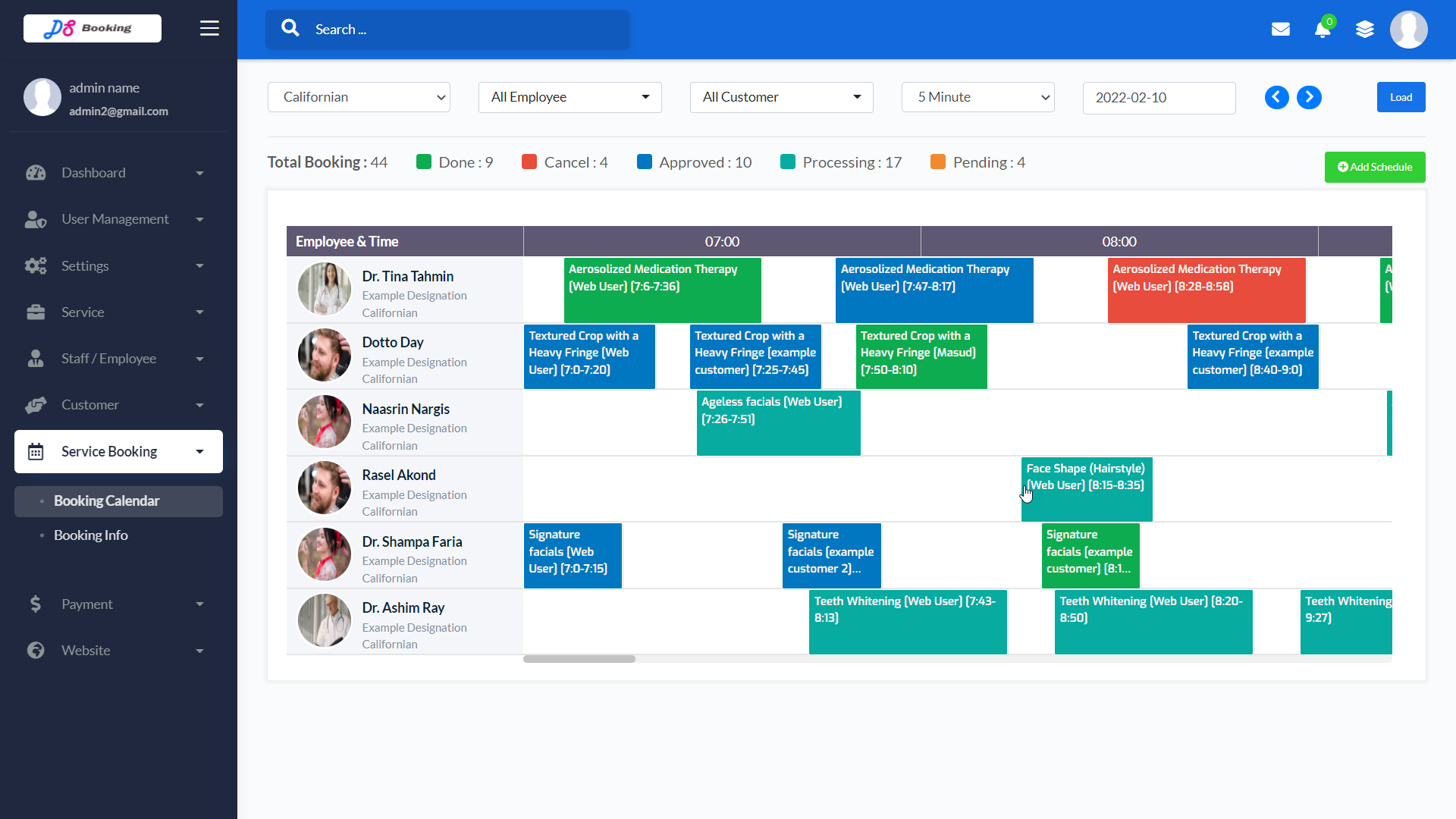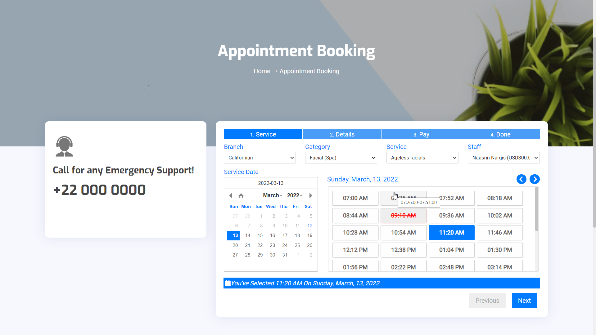 DevSteed 预约是最好的水疗、沙龙和任何类型的医生预约和日程预约应用程序之一,具有集成的 CMS 网站。 使用此系统管理员可以自定义服务时间段、每日/每周/每月预订和取消限制、员工明智的服务和服务价格、网站外观(徽标、Theam 颜色、背景图像、菜单颜色、常见问题解答、关于我们、照片库、 联系我们,谷歌地图)等,支付网关配置,用户角色和资源权限等,如用户所愿。