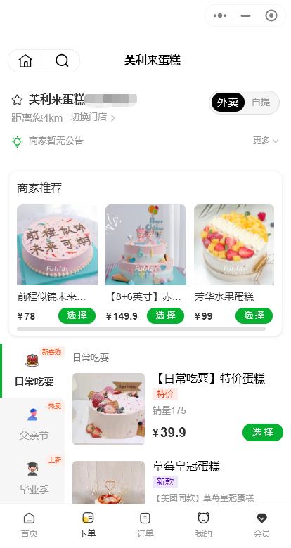 今天案例推荐官点点给大家介绍的是一个蛋糕店小程序开发上线案例,程序主要实现:蛋糕在线订购平台,涵盖:生日蛋糕,儿童蛋糕,节日蛋糕等,用户能够通过定位查看附近蛋糕店的位置信息,可以根据距离选择相对应的门店。平台根据不同的节日活动或使用场景(例如:婚礼、生日、下午茶)等,将商品精心分类,让用户可以快速便捷地挑选到符合心意的商品。同时平台提供在线预订功能,让用户可以在特定时间内收到商品。消费者购买产品还会产生积分,积分可以兑换成金额或者兑换其他商品,增加其他品类商品的销售额。我们一起来看看案例吧