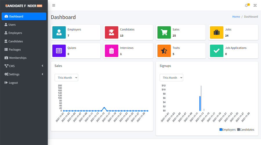 Candidate finder SaaS 是一个高级招聘门户网站,雇主可以在其中注册并支付独特的功能,例如他们自己的带有品牌的网页部分,进行在线测验和候选人面试。 它独特的工作委员会允许雇主在申请候选人之前对他们进行分析和审查。 系统的管理员/所有者可以制作任意数量的包月和年度订阅,雇主可以根据这些订阅付费会员资格。 借助丰富的 CMS 功能,可以轻松控制前端网站上的菜单、页面、新闻和其他必要内容的内容。