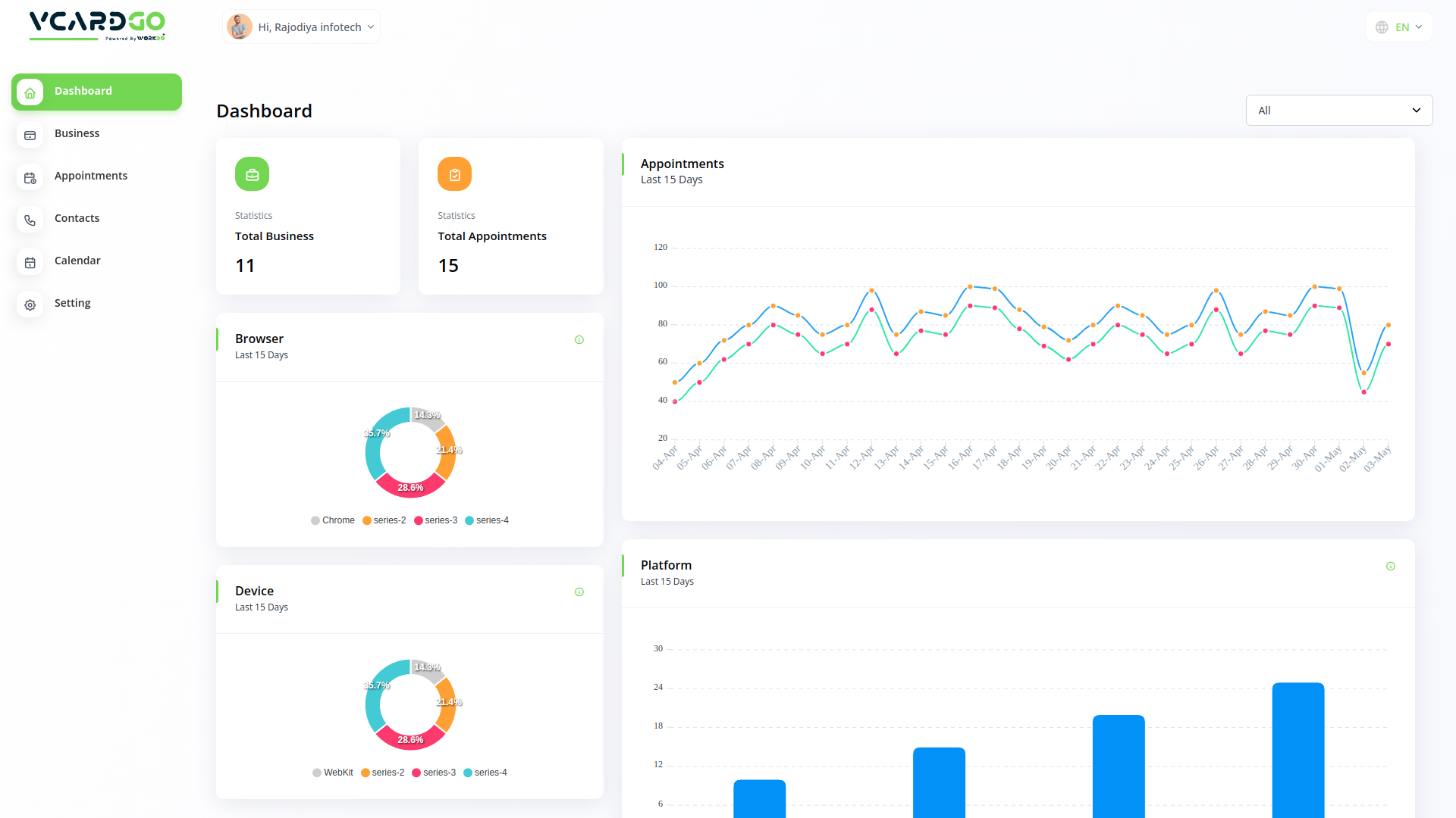vCardGo SaaS 有一个包含所有基本细节的综合仪表板。我们都同意仪表板让我们的生活更轻松。您可以通过图形显示轻松识别过去 30 天期间与特定业务相关的业务和约会。除此之外,您还可以获得在哪些设备、浏览器和平台上查看您的卡片的可视化表示。