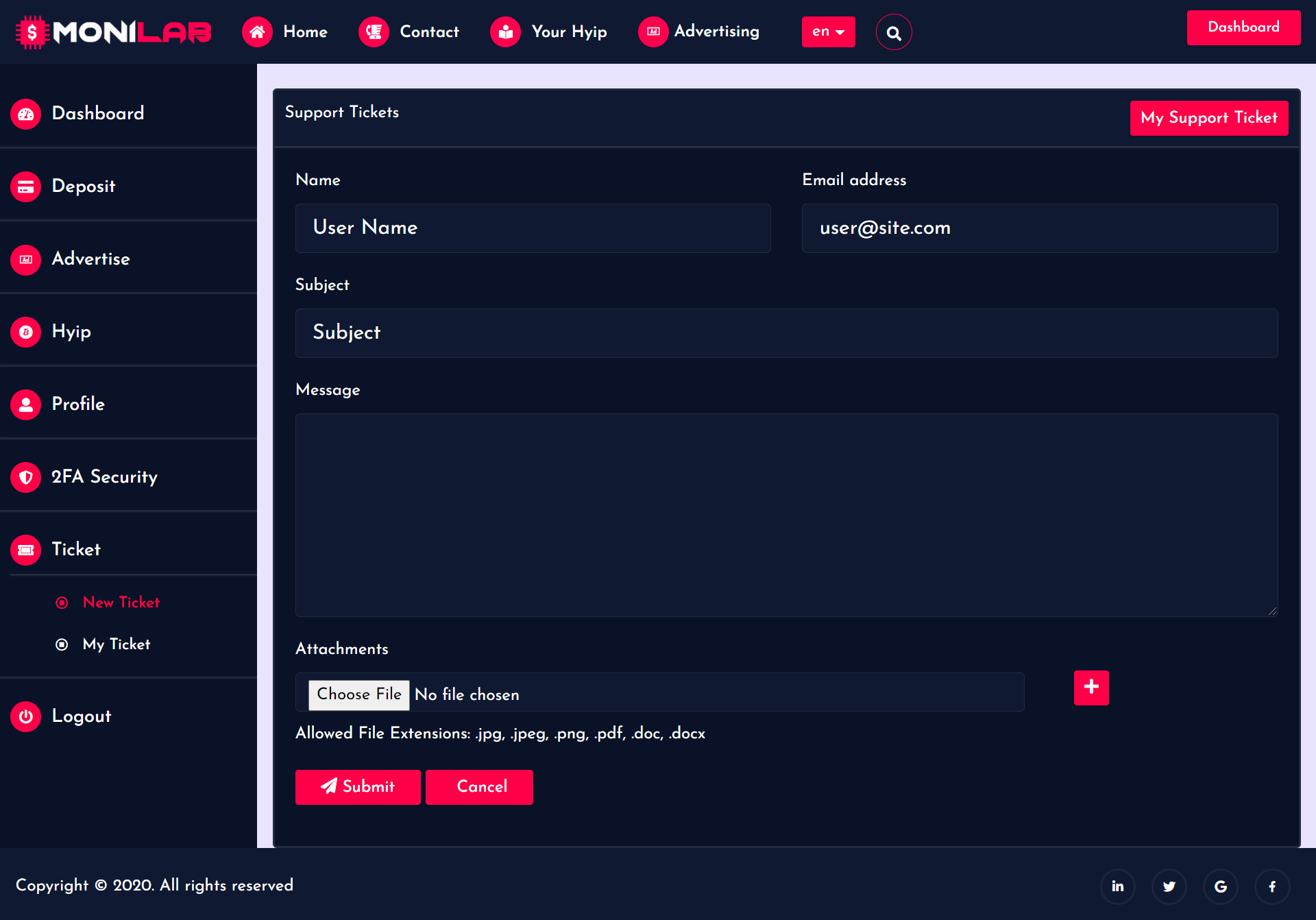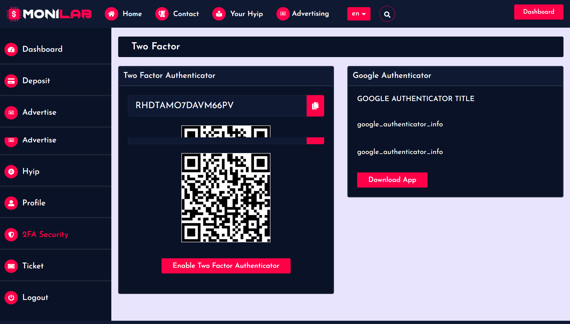 需要一个简单、黑暗、优质和强大的 HYIP 列表或监控网站。 无需支付数千美元聘请开发人员来构建您的 HYIP 监控网站。 MoniLab 可以帮助您处理无限的用户、列表、评论、投票、广告、反应等。 我们包括一个报告系统以提高效率。 使用我们的系统设置您的网站只需几分钟。 如果您需要,我们还在这里为您提供最好的支持、安装和定制。