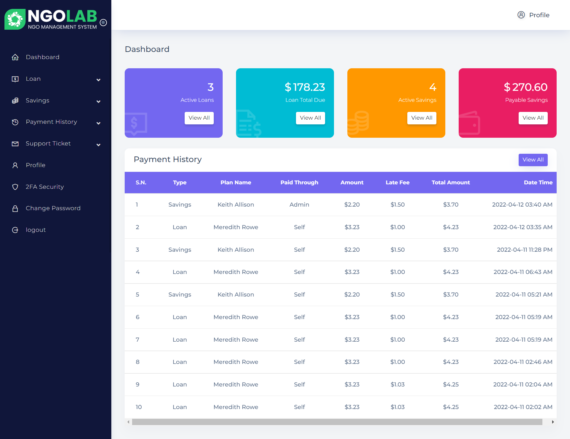 NGOLab,PHP laravel 自带的专业 NGO 管理解决方案。它是为那些想要启动他们的数字 NGO 平台的人开发的。在全球范围内,根据联合国开发计划署的数据,除了以社区为基础的数十万组织之外,世界上还有大约 40,000 个非政府组织。在这里,客户可以通过激活他们的账户来开始储蓄或贷款,工作人员可以管理他们并从他们那里收取现金,还有数字自动支付方式。 admin 可以管理整个系统。