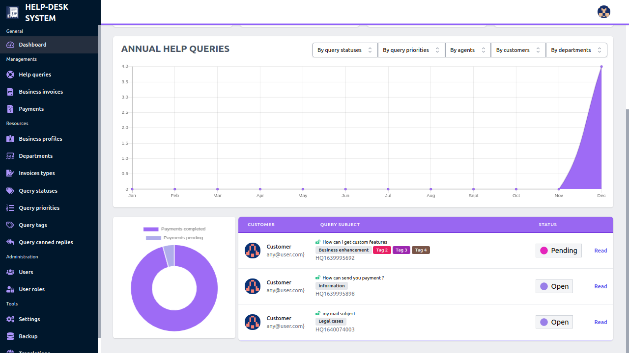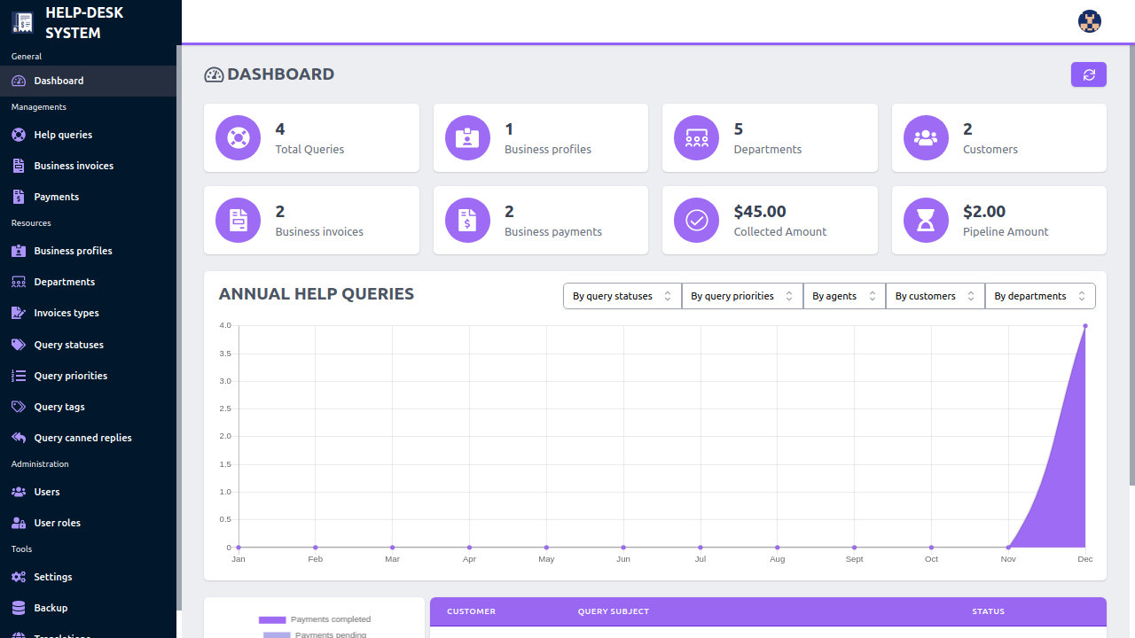 业务帮助台是一个在为客户、代理和管理员注册系统提供支持服务的背景下处理客户业务查询的系统。 客户可以提交他/她的查询票,他将通过电子邮件/短信警报(如果已配置)收到通知。当管理员或授权代理响应客户时,也会收到通知。 它还能够为客户生成多种类型的业务发票。 也可以进行商业支付。 并且客户可以看到该企业提交的查询、发票和付款请求。