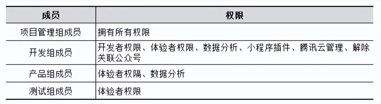 管理者可以很方便地分配这些权限给项目的各个成员,小程序的管理比传统的网页开发和APP应用开发更为简单便捷。开发团队的成员权限可以按照表1-7所示进行分配。