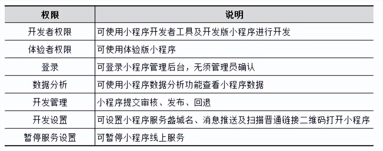 小程序管理后台允许开发团队中的不同身份的成员登录,通过权限控制来区分不同的用户身份,具体可以在“小程序管理后台”一“用户身份”一“成员管理”中查看。下面列举几个常见的权限,如表1-6所示。