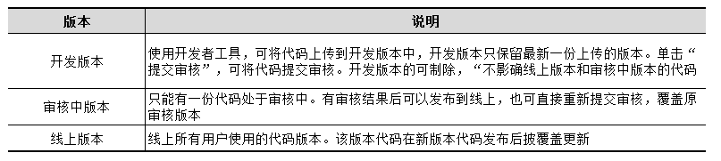 在小程序开发的一般流程中,先由开发者编写代码并自测,直到程序达到一个稳定可体验的状态时,开发者会把这个体验版本交给产品经理和测试人员进行体验测试,最后修复程序的Bug后发布,供外部用户正式使用。小程序的管理后台根据这个流程设计了小程序的不同版本,如表1-8所示。