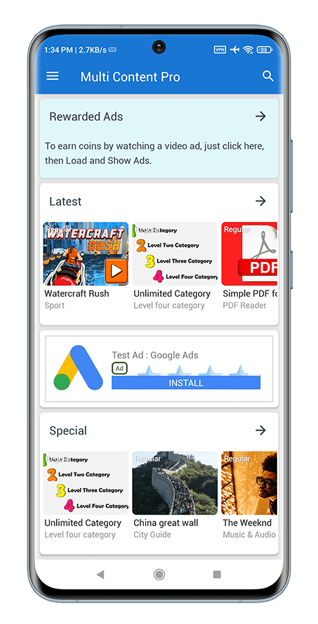 Multi Content Pro(应用程序和网站)是一个在Android平台和Web浏览器下运行的移动和网站内容管理系统,用于您自己的视频、音乐、HTML5游戏、文本、文章、新闻、PDF阅读器、直接URL、下载文件 、产品、目录、买卖、广告、城市指南以及来自 Android 5.0 及更高版本的支持。 借助强大且响应迅速的管理仪表板,可以管理用户、页面、滑块、推送通知、无限类别和 4 级子类别并发布任何类型的内容。