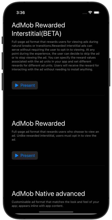 代码被高度记录、标记和组织良好。 SwiftUI AdKit 基于 iOS 15+ 构建。我们还处理了所有类型的权限问题(iOS 14、iOS 15+)。对于高级用户,我们添加了所有必需的回调/委托,您可以通过它们配置广告并在需要时使用它们。
