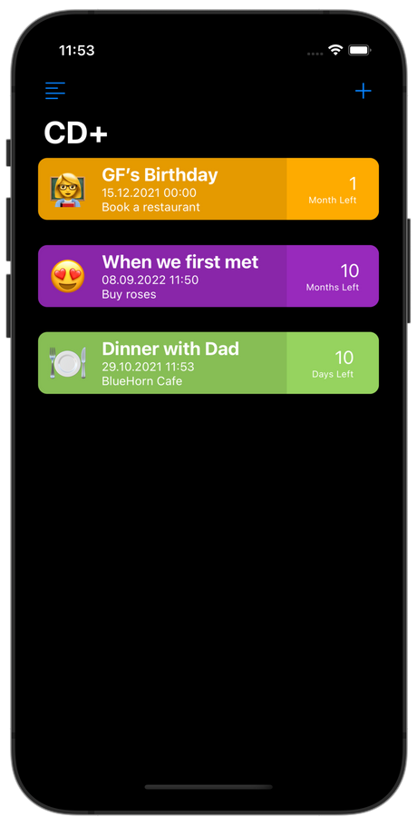 CountDownPlus 是一个基于 SwiftUI 的 iOS 应用程序,用于存储您喜欢的日期。该应用程序非常容易定制和重新皮肤。 CountDownPlus 应用程序采用简约设计,可存储您生活中的重要时刻和日期。您可以将它用于几乎各种活动,从假期和聚会到健身目标和目标。