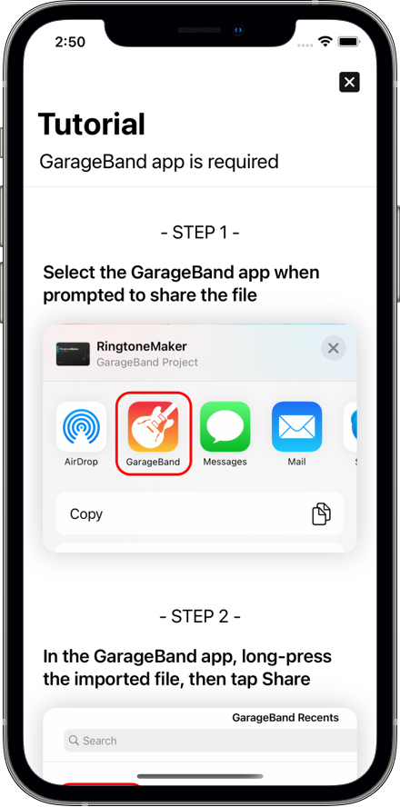 – 铃声将始终呈现原生底部共享视图,用户必须在其中选择 GarageBand 应用程序,然后他们可以将铃声文件导出到 iPhone 的铃声库中。