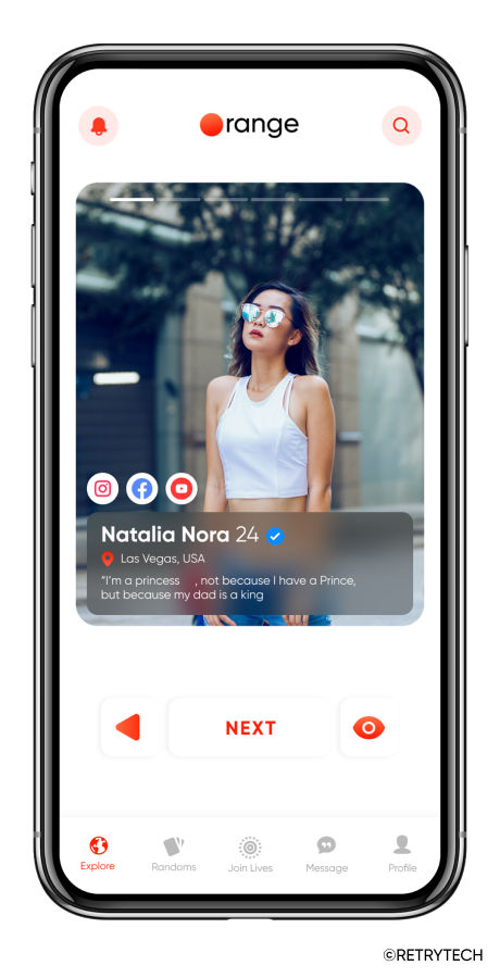 Orange 应用程序是非常高效的约会应用程序,具有许多高级功能,例如个人资料卡、随机呼叫、聊天、视频通话、地理位置搜索、实时流媒体等等。