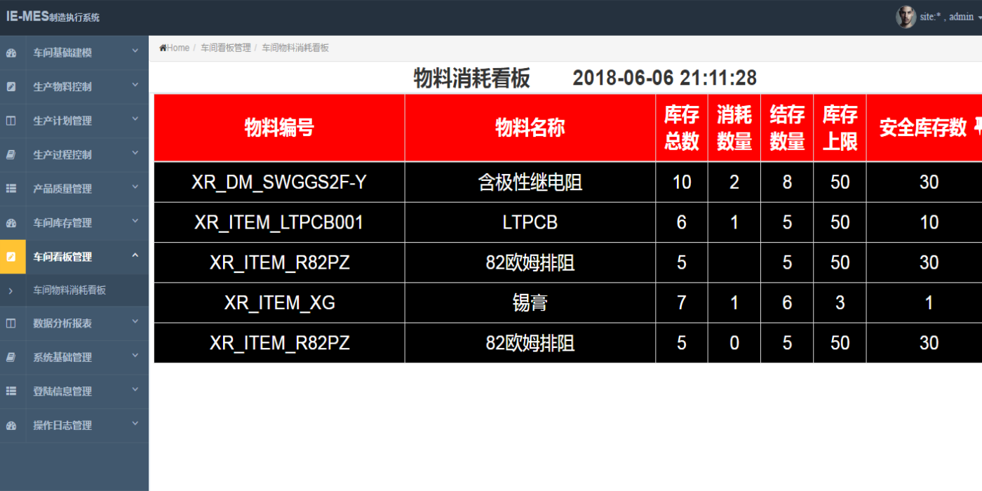 7、车间看板管理:车间物料消耗看板(包括物料名称、库存数、消耗数、结存数、库存上限、安全库存数)。