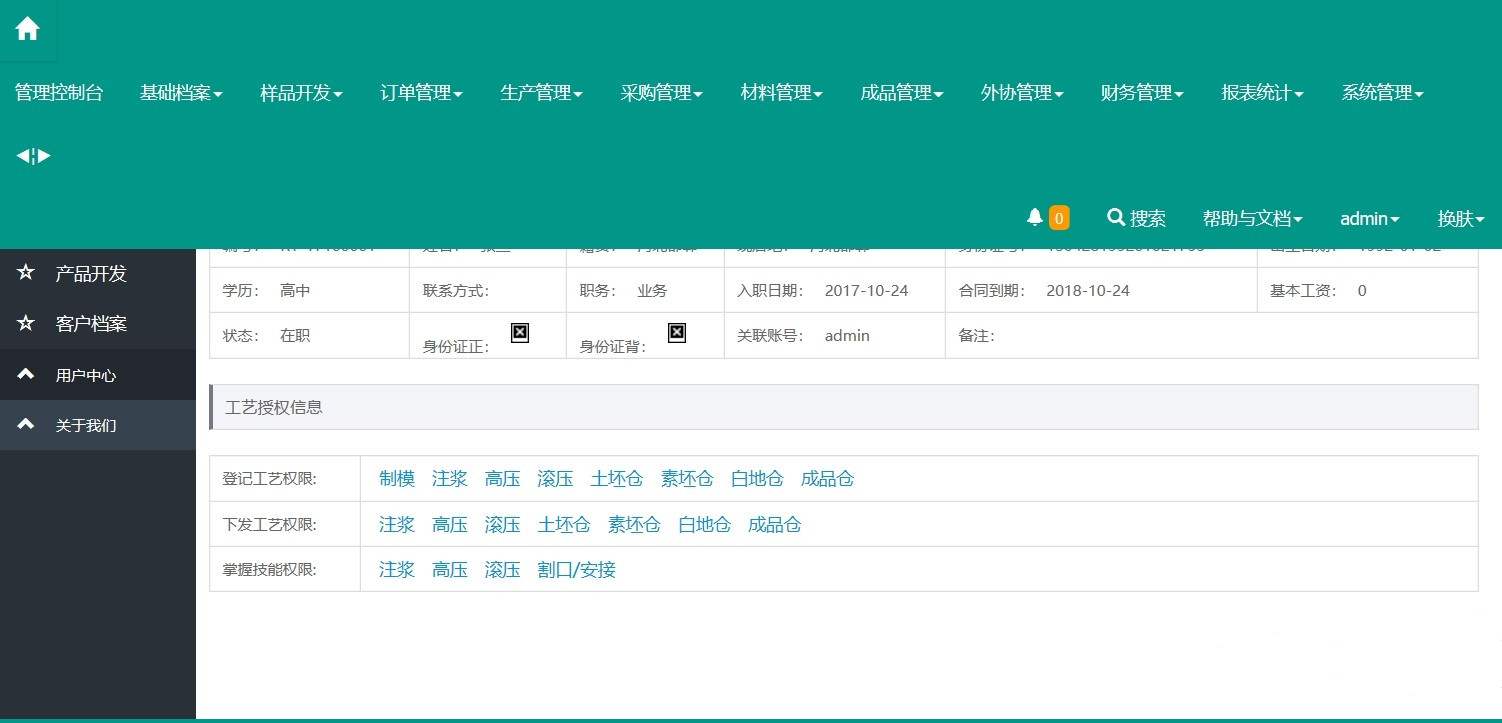 客户档案 供应商档案 外协档案 物料档案 产品档案 产品BOM 模具档案 工价档案 人员档案