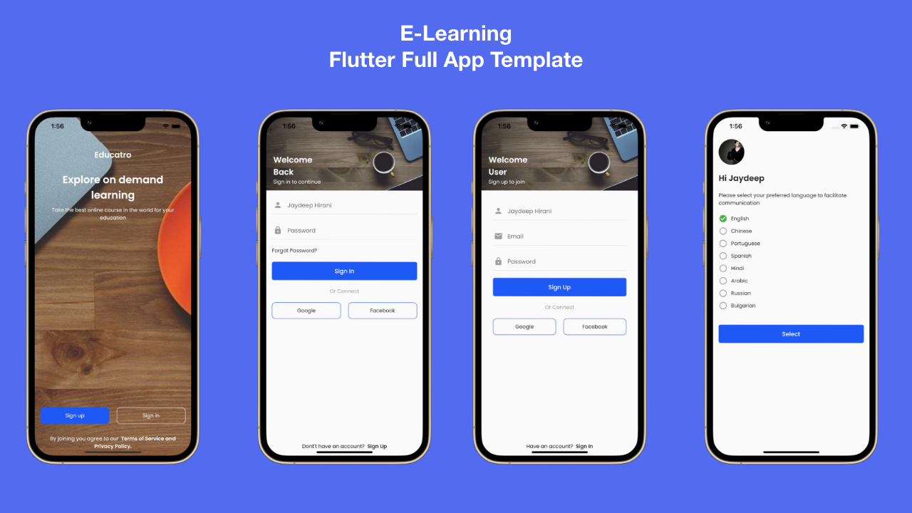 Flutter E-Learning 完整应用克隆模板 – Flutter 2.8.0+ 版是一个 Flutter 完整应用模板,允许您在 Android/iOS 上使用您的应用 UI 页面,该应用的许多不同功能已经开发,以使用户更流畅所有用户的体验。