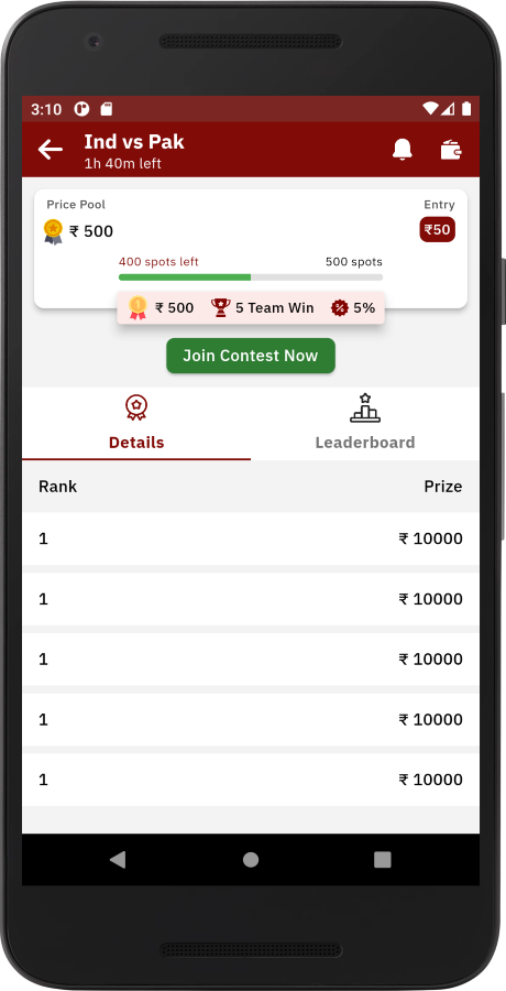 在基于分数决定输赢比赛后,用户可以组队并进行比赛。 像 Dream 11、Howzatt 和其他奇幻板球游戏应用程序。