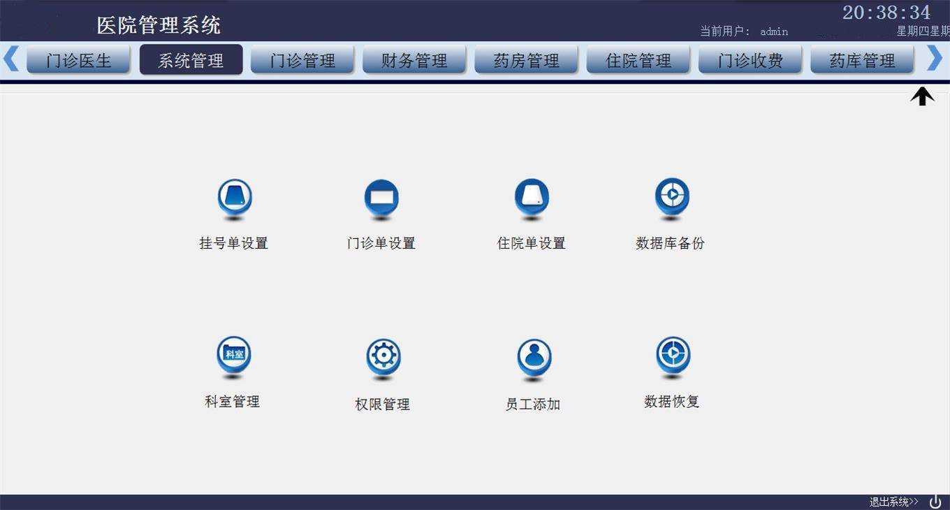 三,功能菜单:门诊医生 系统管理 门诊管理 财务管理 药房管理 住院管理 门诊收费 药库管理
