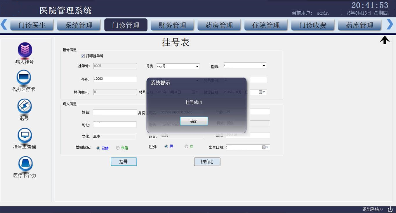 3、门诊管理(病人挂号、代办医疗卡、退号、挂号表查询、医疗卡补办)。
