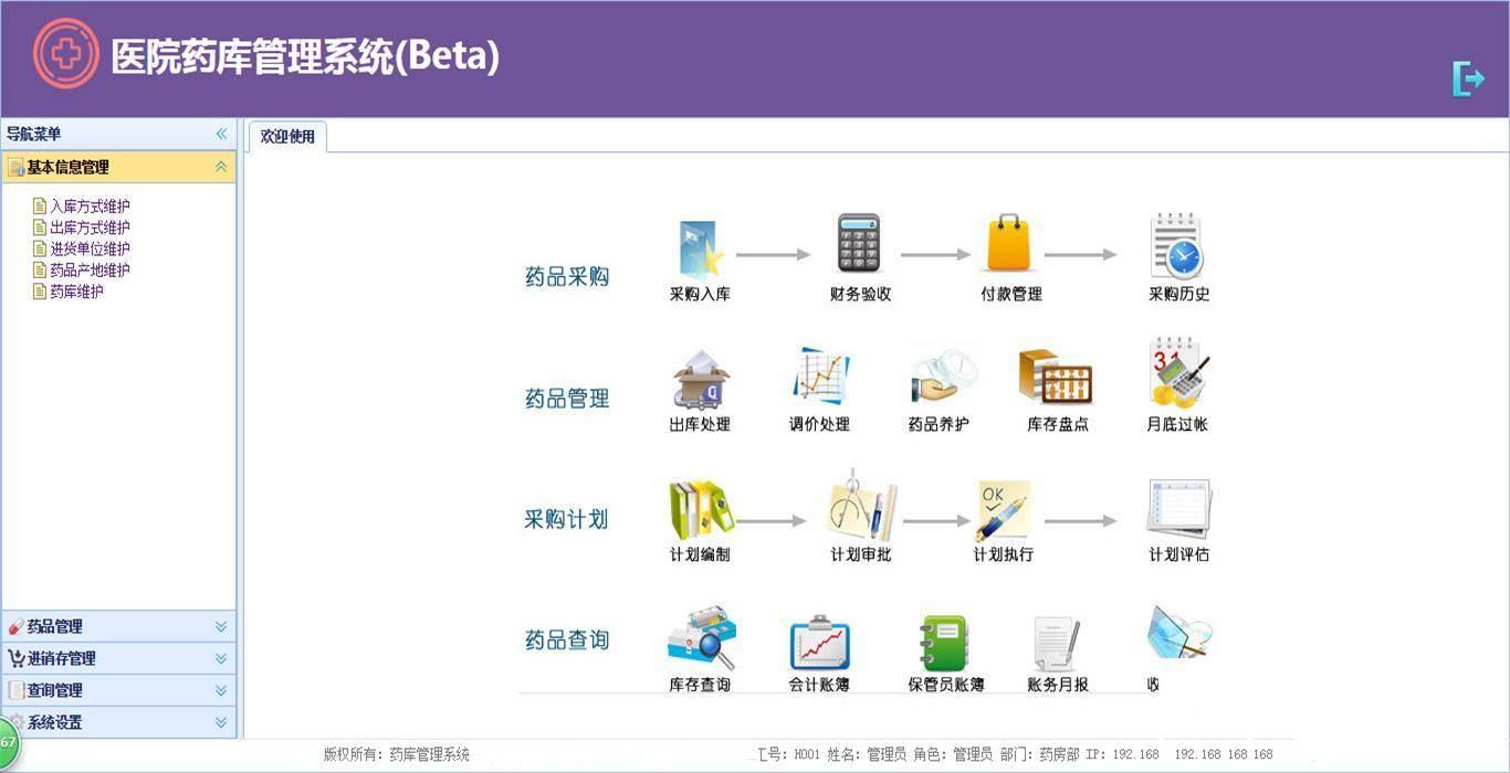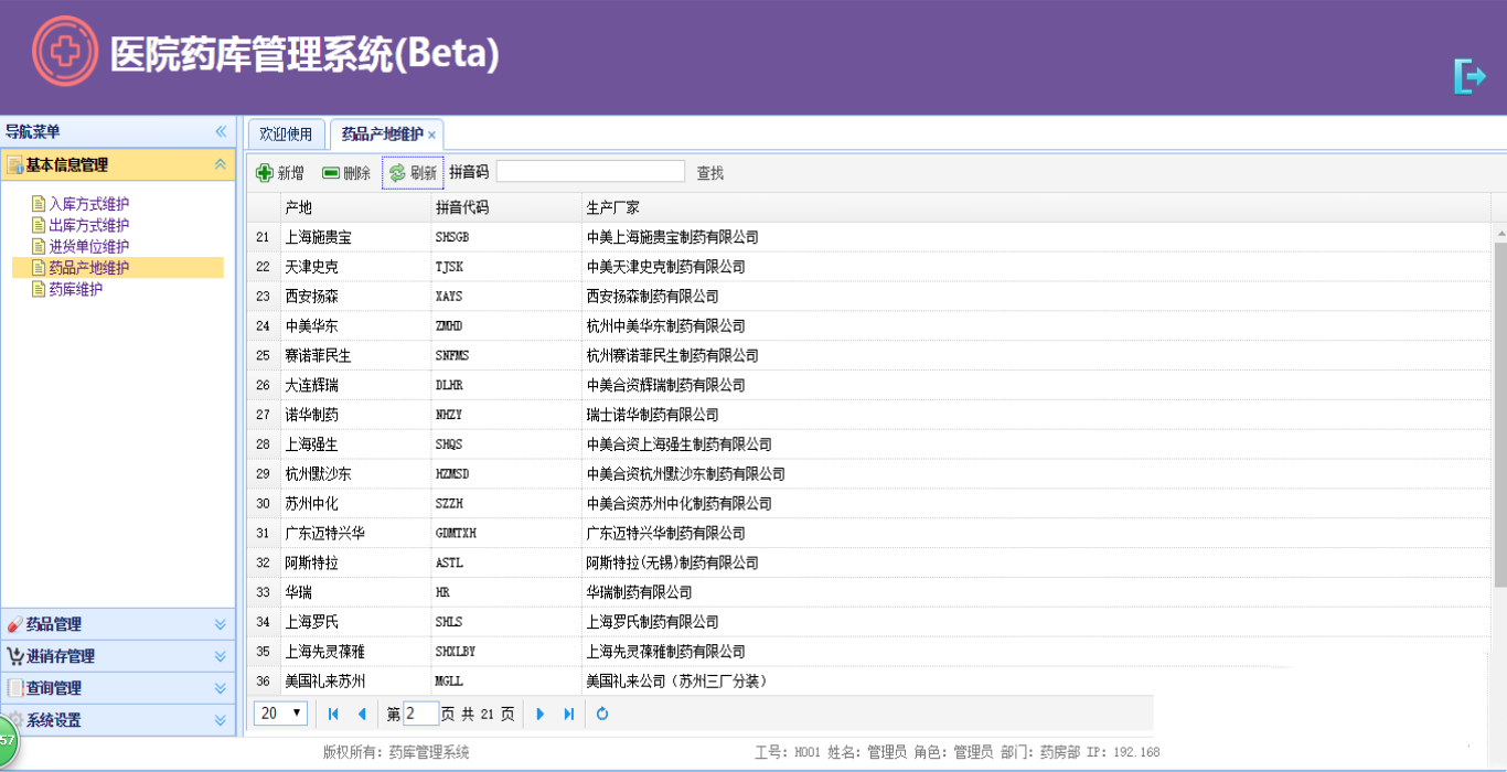 1. 基本信息管理:维护数据库中基本的外键表,保证数据的参照完整性。有入库、出库方式维护、进货单位维护、药品产地维护、药库维护。