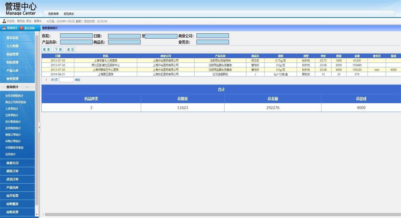 7 、查询统计:业务员销售统计、商业公司库存查询、入库单统计、出库单统计、应付账款统计、应收账款统计、销售订单统计、采购订单统计、中间商库存查询、业务统计