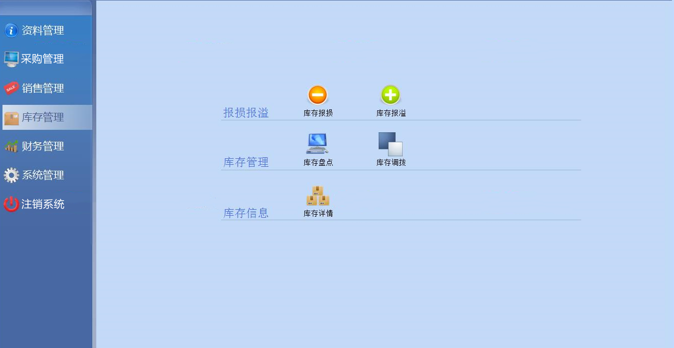 (1)库存报溢(2)库存报损(3)库存盘点(4)库存调拨(5)库存详情