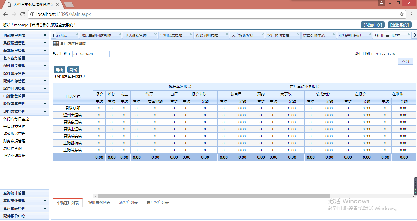 八,查询统计管理: 采购入库查询、采购退货查询、维修出库查询、维修归库查询、本厂出库查询、销售出库查询、销售退货查询、配件备货查询、配件盘库查询 客服统计管理: 客户资源分配、修后回访统计、流失回访统计、电话销售统计、 营运报表管理: 服务顾问日报表、店长日报表、营运经理日报表、服务顾问查询报表、店长查询报表、营运经理查询报表。