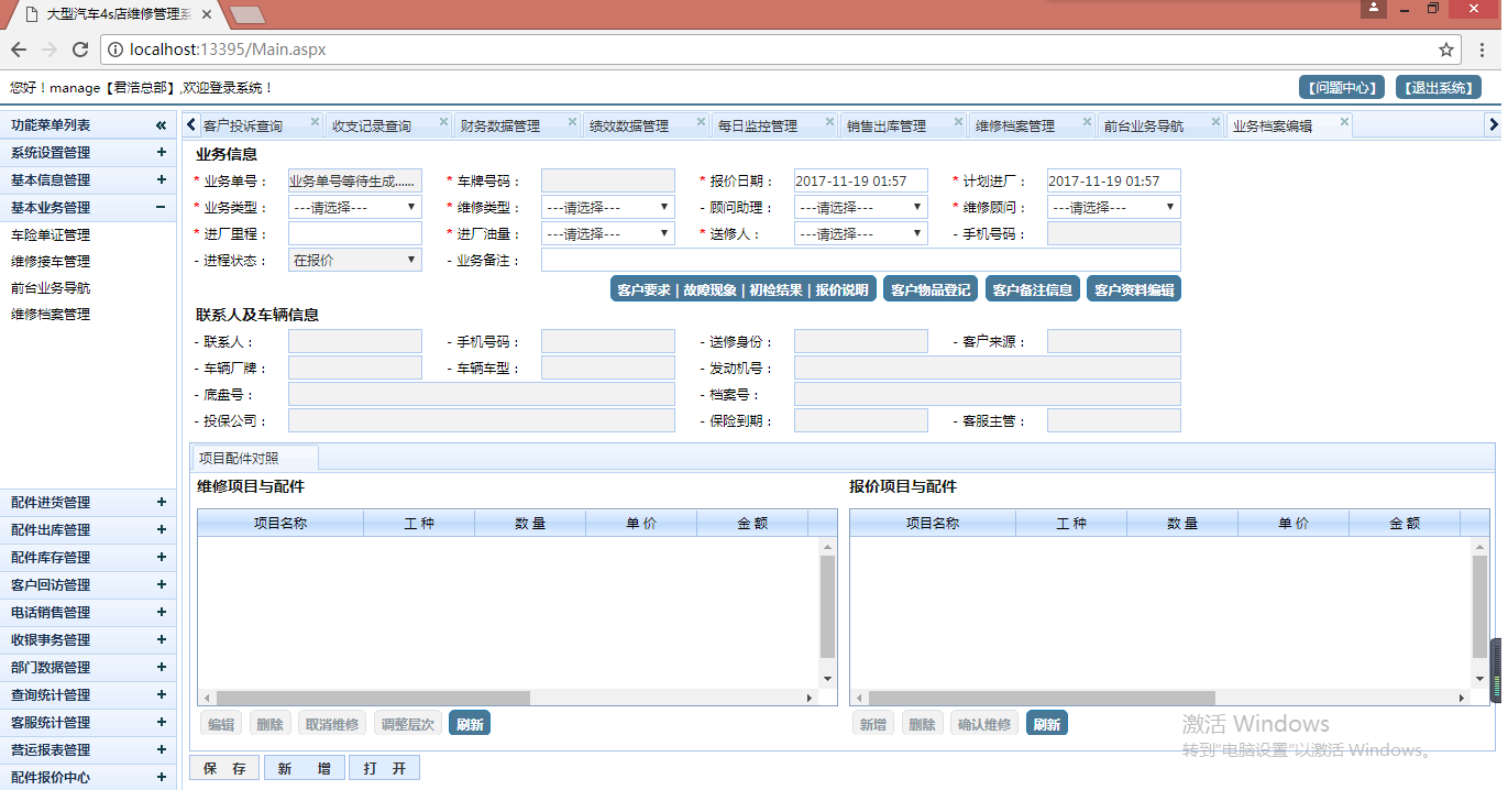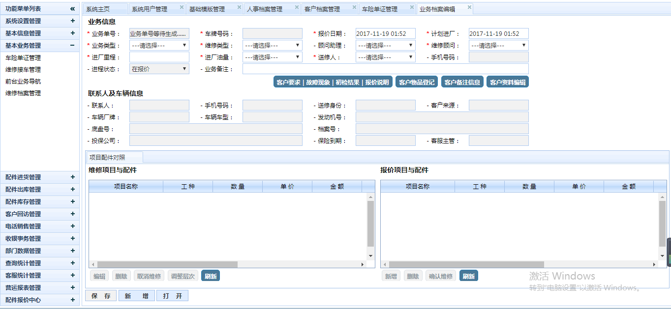 五,基本信息管理: 人事档案管理、客户档案管理、车辆档案管理、维修项目管理、维修项目分类管理、维修配件管理、维修配件分类管理、车辆厂牌车型管理、供应商档案管理、客户档案管理、车辆档案管理。