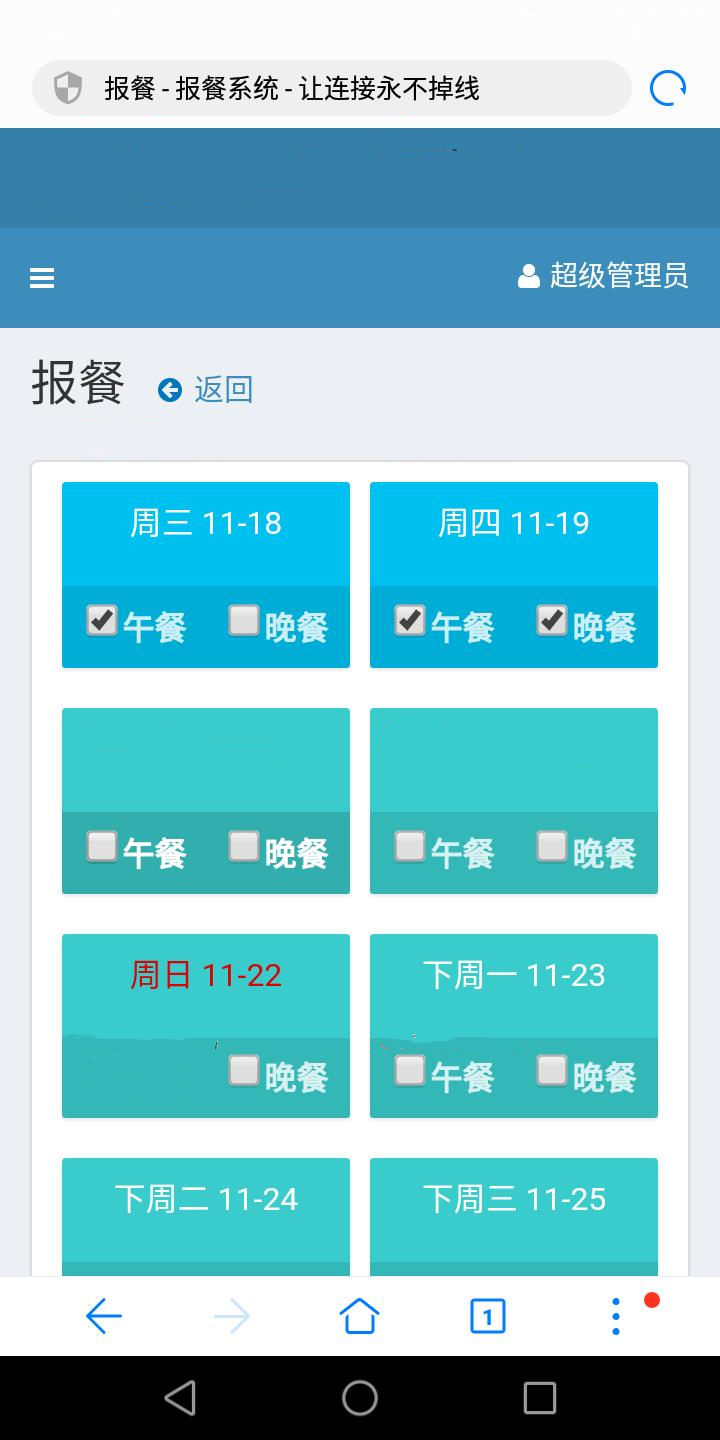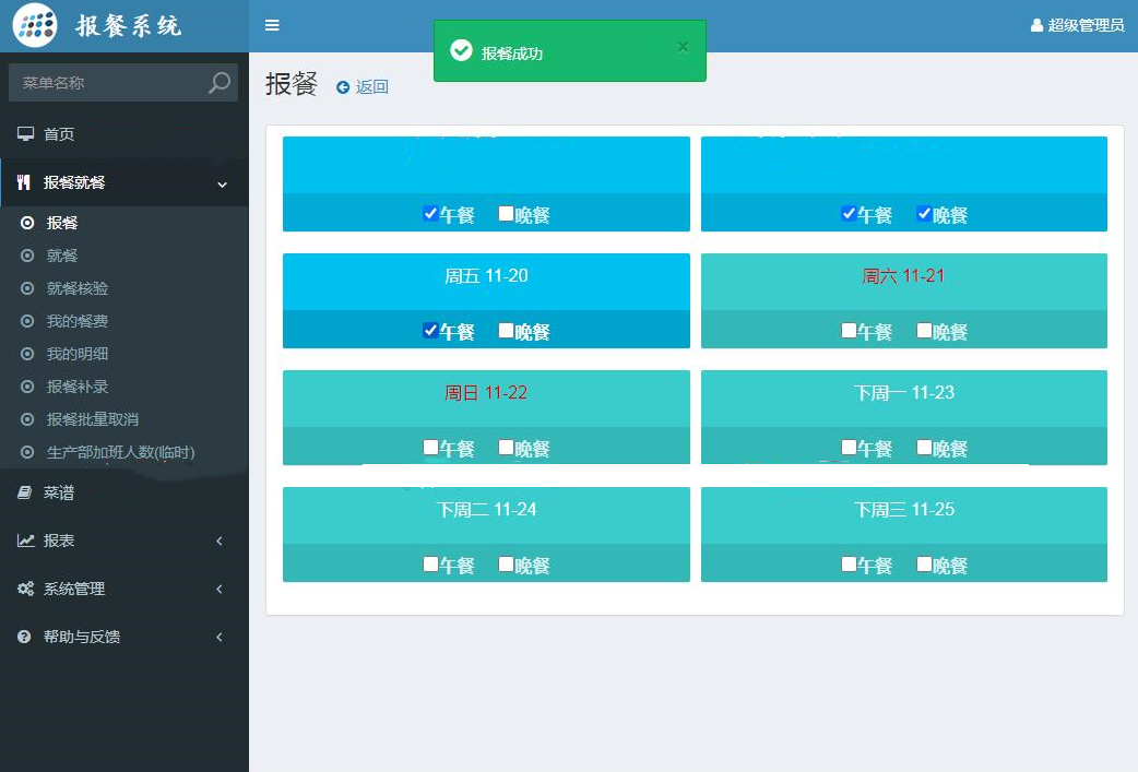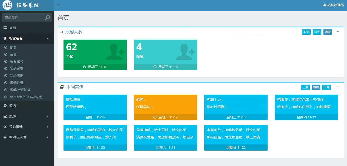 2、报餐就餐:报餐、就餐、就餐核验、我的餐费、我的明细、报餐补录、报餐批量取消、生产部加班人数(临时)
