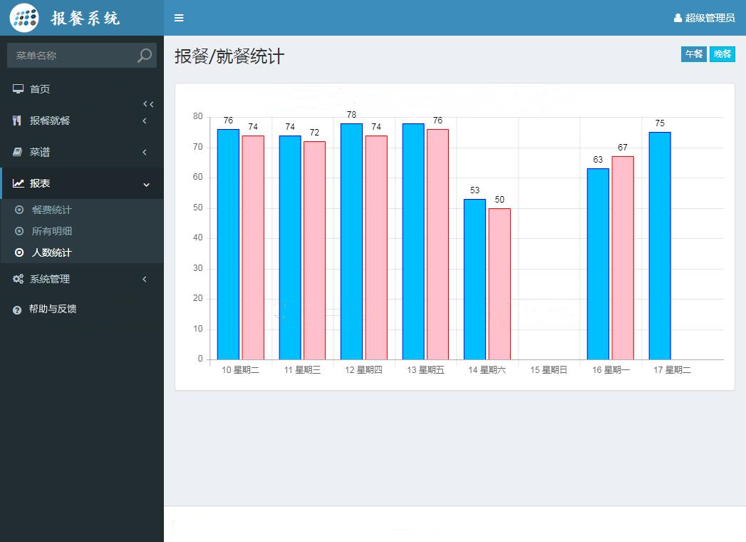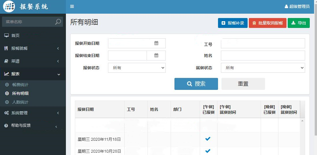 4、报表:餐费统计、所有明细、人数统计