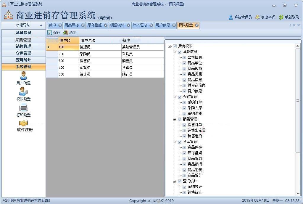 6、系统管理:用户信息,权限设置,打印设置,软件注册。