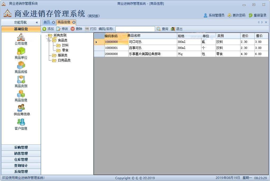 1、基础信息:公司信息,商品单位,商品规格,商品类别,商品信息,供应商信息,客户 信息。