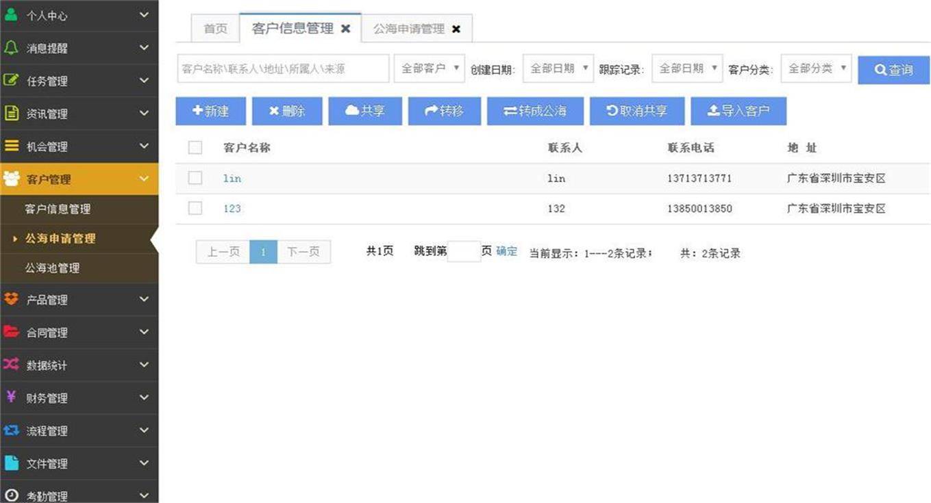 公海池管理:公海池中的客户可以申请、转移、共享、生成客户。