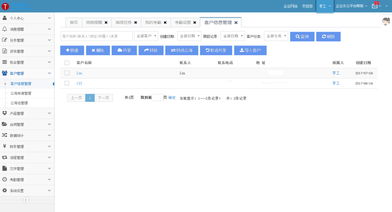 上所有信息。并可以对客户信息共享或放入公海或申请或指派。