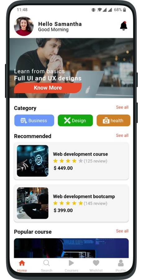 ELearning 是一个学习移动应用程序模板。 使用 React Native 开发的 ELearning Pro。 这意味着 UI 兼容 Android 和 iOS。 在这个应用程序中添加了动画,干净的代码,格式良好,易于理解等等。 我没有形容词。 因此,请安装我们的 android 演示应用程序并自行检查所有功能。