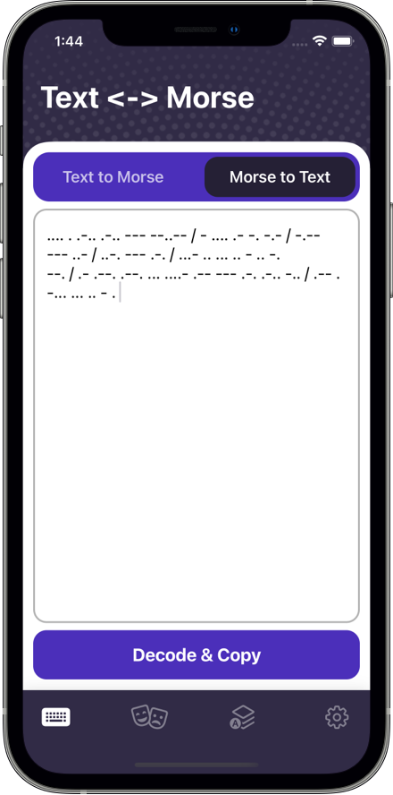 – 在主选项卡“转换器”选项卡上,用户可以键入常规文本并将其编码为莫尔斯,或粘贴莫尔斯文本以将其解码为常规文本。 morse to text 选项,将自动检测从键盘复制的任何文本并对其进行解码。此功能可以通过“设置”选项卡打开,并且仅在用户点击键盘上的解码器键时才有效。