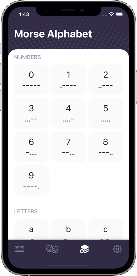 – 在莫尔斯字母选项卡上,用户可以看到所有字符、数字和特殊字符的列表。这些是应用程序支持的唯一字符,因此如果用户输入“[”或我们不支持的任何其他字符,它将仅显示该字符,而无需摩尔斯电码编码。