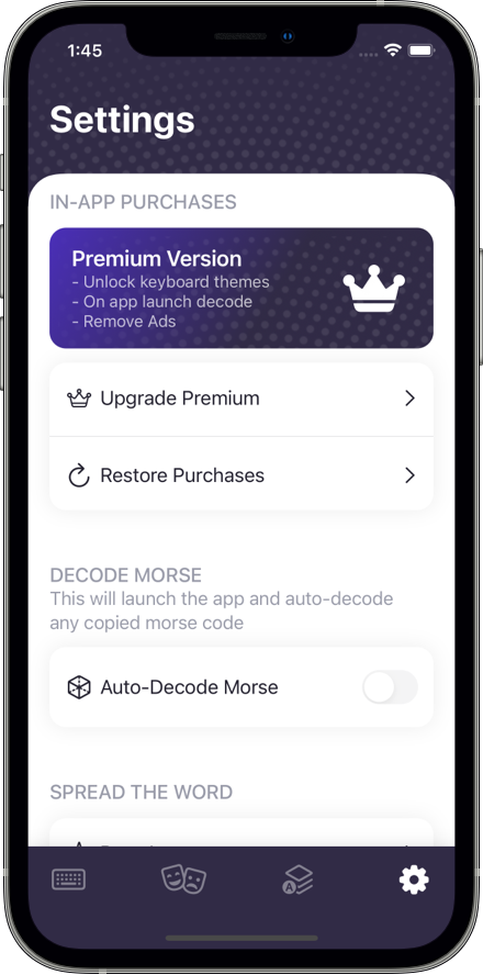 – 设置选项卡是必须的,因为在这里我们为您提供升级到高级版本的选项,让用户可以自由使用没有广告的应用程序,解锁所有键盘主题,当然,启用自动解码功能,如上所述,只要用户复制了任何莫尔斯电码,他们只需点击键盘上的解码(立方体图标)按钮,KeyMorse 应用程序就会启动并自动解码他们复制的莫尔斯电码。