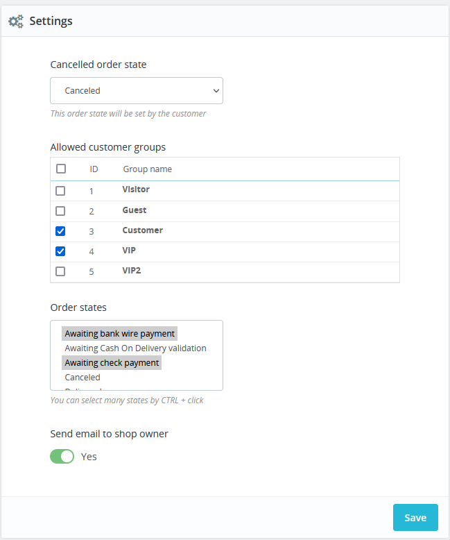 您可以通过设置特定的客户组来控制允许谁取消订单。 该模块还允许您设置允许取消的订单状态。