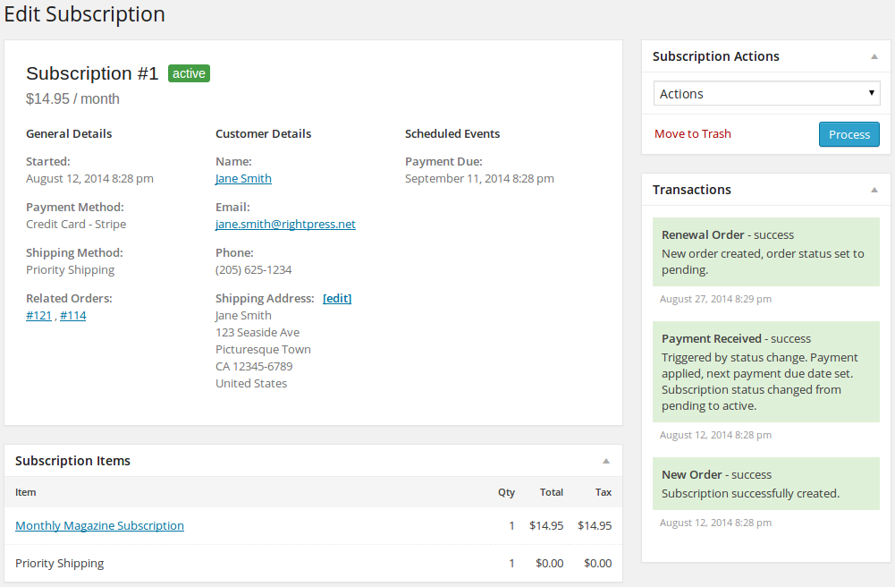 简单和可变产品都可以配置为订阅,并允许您设置付款周期、免费试用期、订阅期和设置费。当客户购买订阅时,将启动订阅流程,其中包含按时间顺序排列的以下操作: