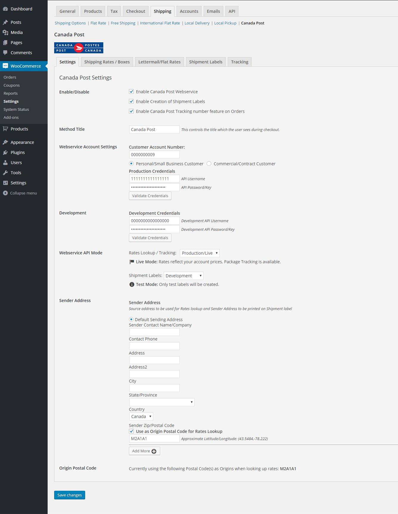 可以从此插件创建加拿大邮政运输标签。可以在 Woocommerce 订单上生成 PDF 标签。然后可以将这些打印出来并在包装上运送。跟踪号会自动添加到此插件的包裹跟踪服务中的订单中。可为非合同(即小型企业/风险投资)以及不需要清单的合同客户生成装运标签。